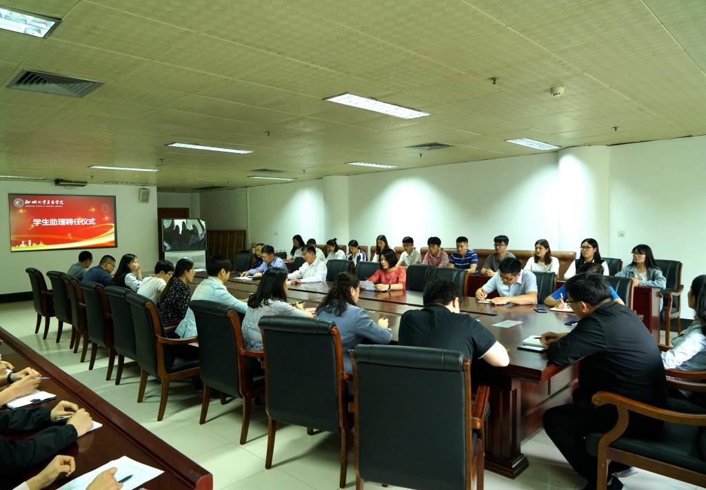 本网讯 5月9日下午,我院第一届学生助理聘任仪式在办公楼二楼会议室举行。党委副书记王敦强,团委书记、学生处处长刘丙利,人事处处长王慧英,学生助理岗位带岗教师及42名学生助理出席仪式。仪式由刘丙利主持。