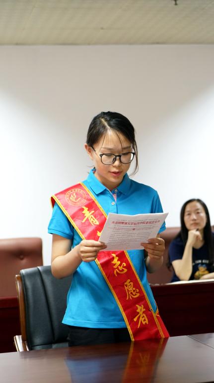 刘丙利宣读了表彰2018年大学生志愿服务西部计划志愿者的决定,志愿者代表王晨在发言中表达了服务西部的意愿和决心。