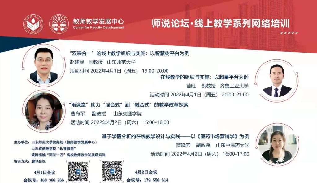 4月1日、2日,学院教务处向全体教师推送山东师范大学教务处(教师教学发展中心)、山东省高等学校“长青联盟”及黄河流域“两省一区”高校教师教学发展研究院共同主办的“师说论坛·线上教学系列网络培训”,此次培训采用腾讯会议直播的方式进行,主讲教师分别以“双课合一的线上教学组织与实施:以智慧树平台为例”“在线教学的组织与实施——以超星平台为例”“雨课堂助力混合式到融合式的教学改革探索”“基于学情分析的在线教学设计与实践——以《医药市场营销学》为例”为主题进行了详细地讲解。