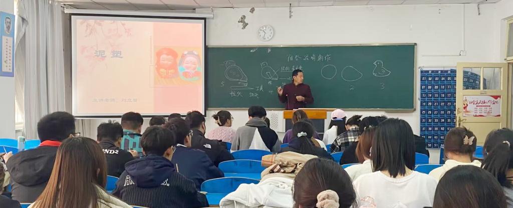 本网讯 为弘扬中华优秀传统文化,坚定文化自信,更好地保护与传承非物质文化遗产,10月26日上午,美术设计系在3号教学楼南206多媒体教室开展非遗阳谷泥哨制作活动。特邀非遗传承人刘立曾为主讲人,美术设计系2022级影视动画专业全体学生参加。