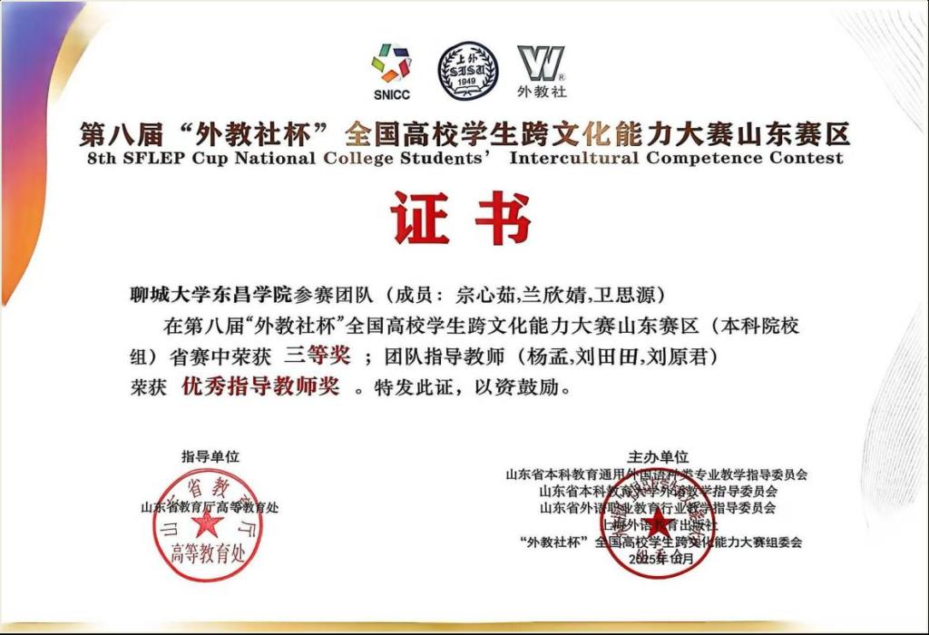 本网讯 近日,第八届“外教社杯”全国高校学生跨文化能力大赛山东赛区赛事在济南圆满落幕。我校外国语系学子历经三个月精心备赛与两天激烈角逐,凭借扎实的专业素养和出色的临场表现,最终斩获山东赛区三等奖。