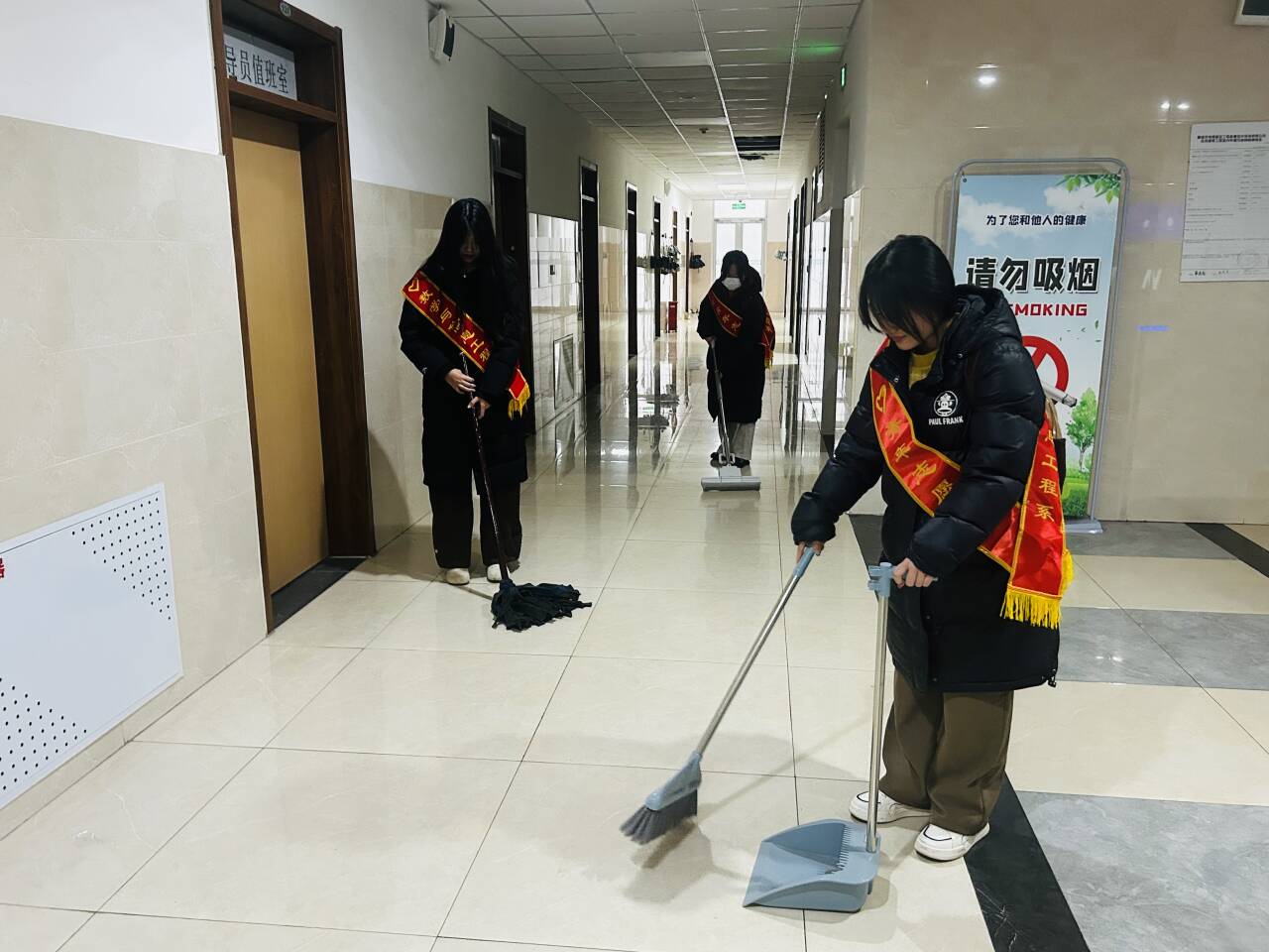 随后,学生党员们分组开展志愿服务,对公寓楼内公共区域开展全方位、精细化的清洁整治工作。从楼道走廊到公共活动室,从扶手栏杆到卫生死角,大家以认真负责的态度落实清洁任务,用实际行动践行共产党员的责任担当与奉献精神,为同学们营造了干净整洁、舒适宜居的居住环境。
