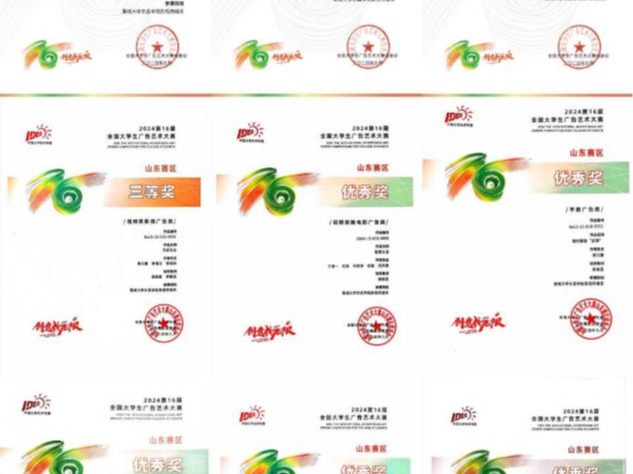 我校影视传媒系学子凭借扎实的专业功底荣获多项奖项。其中国家级优秀奖3项,山东省二等奖1项、三等奖4项、优秀奖8项。
