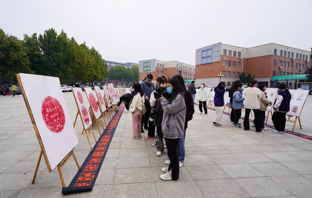 10月14日上午,美术设计系于南广场举办“喜迎二十大 非遗绽芳华”剪纸、木版年画、面塑课程作品展。